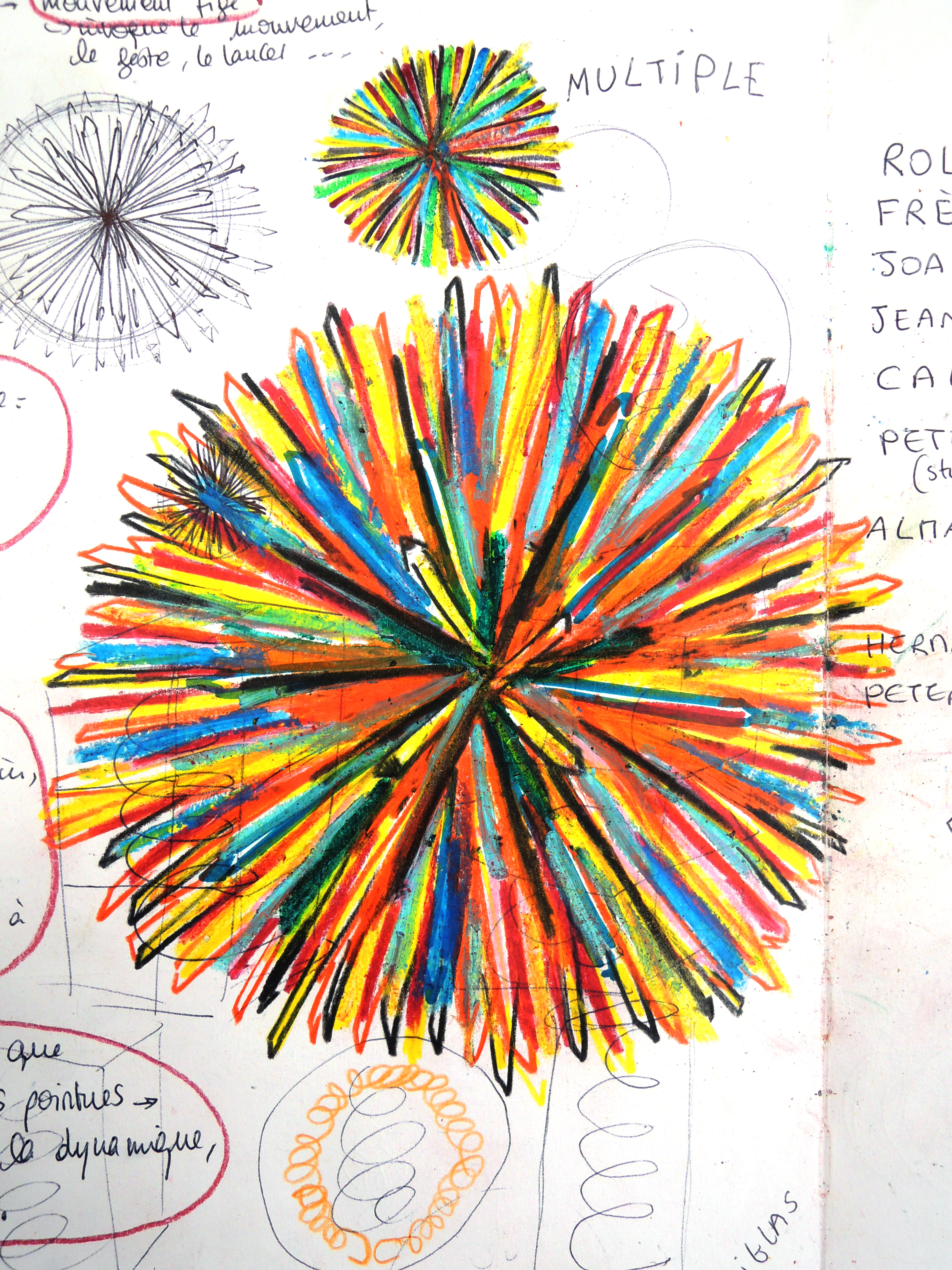 Concentré d’énergie, force centrifuge dynamisée à chaque pointe, c’est un appel au jeu, au dessin vif et spontané. C’est un feu d’artifice, une boule de dynamite colorée. On l’imagine rouler sur elle-même, dévaler les pentes, ancrant dans le sol ses trajectoires colorées.