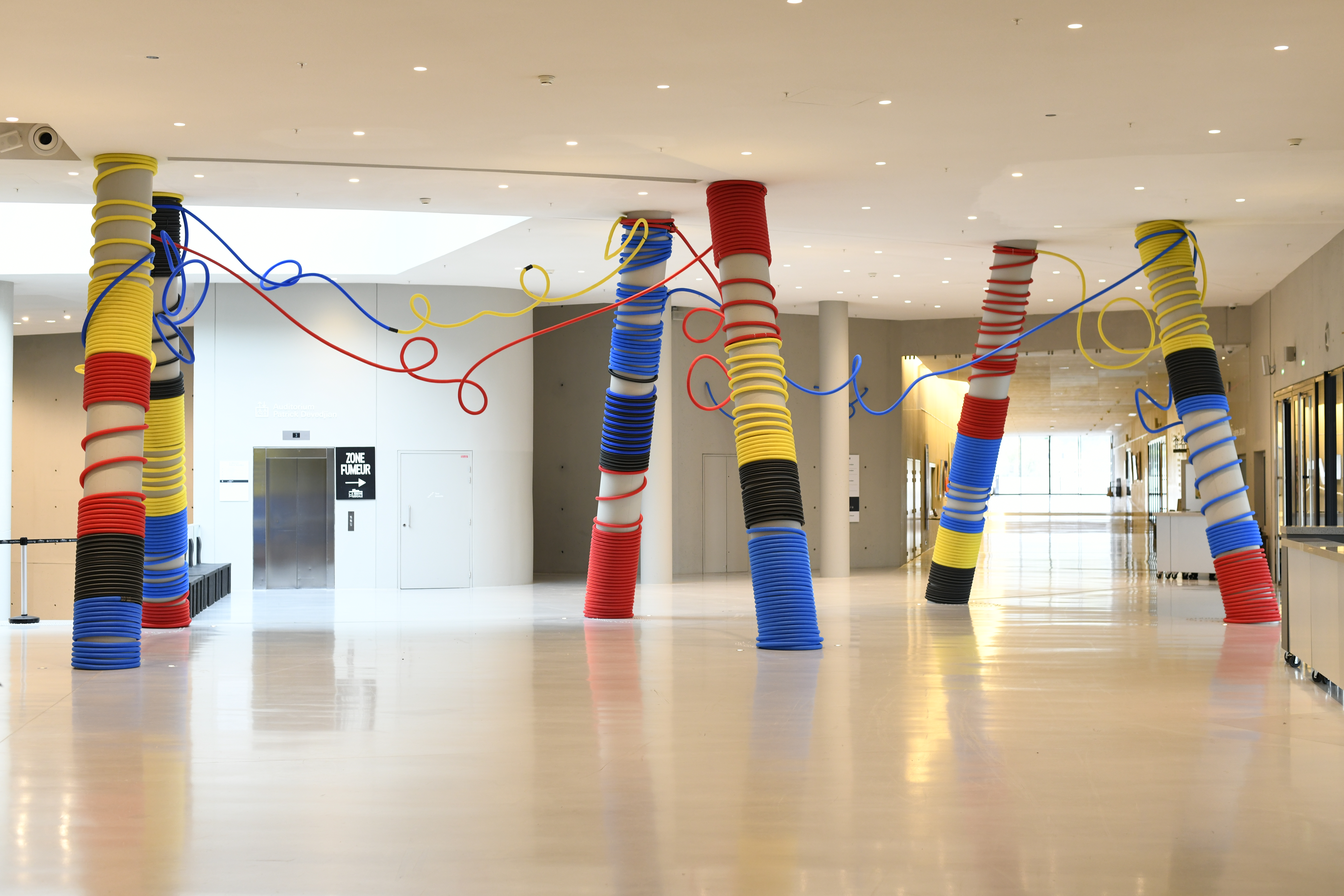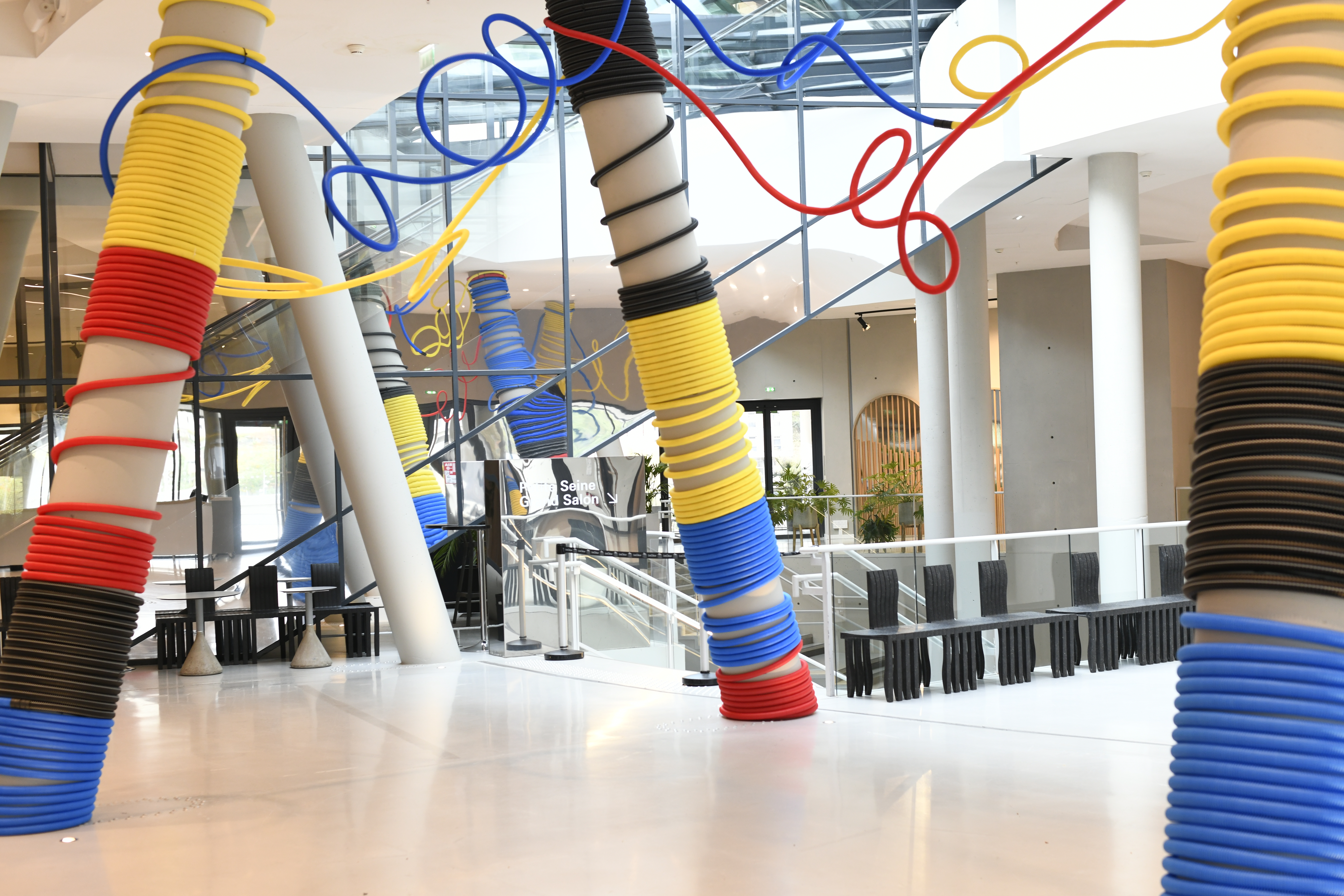 Les tuyaux enroulent les poteaux obliques et renforcent la dynamique de ce bâtiment. Ils déséquilibrent l'espace, déstabilisent le visiteur, et créent une perte de repères, dans un univers festif.