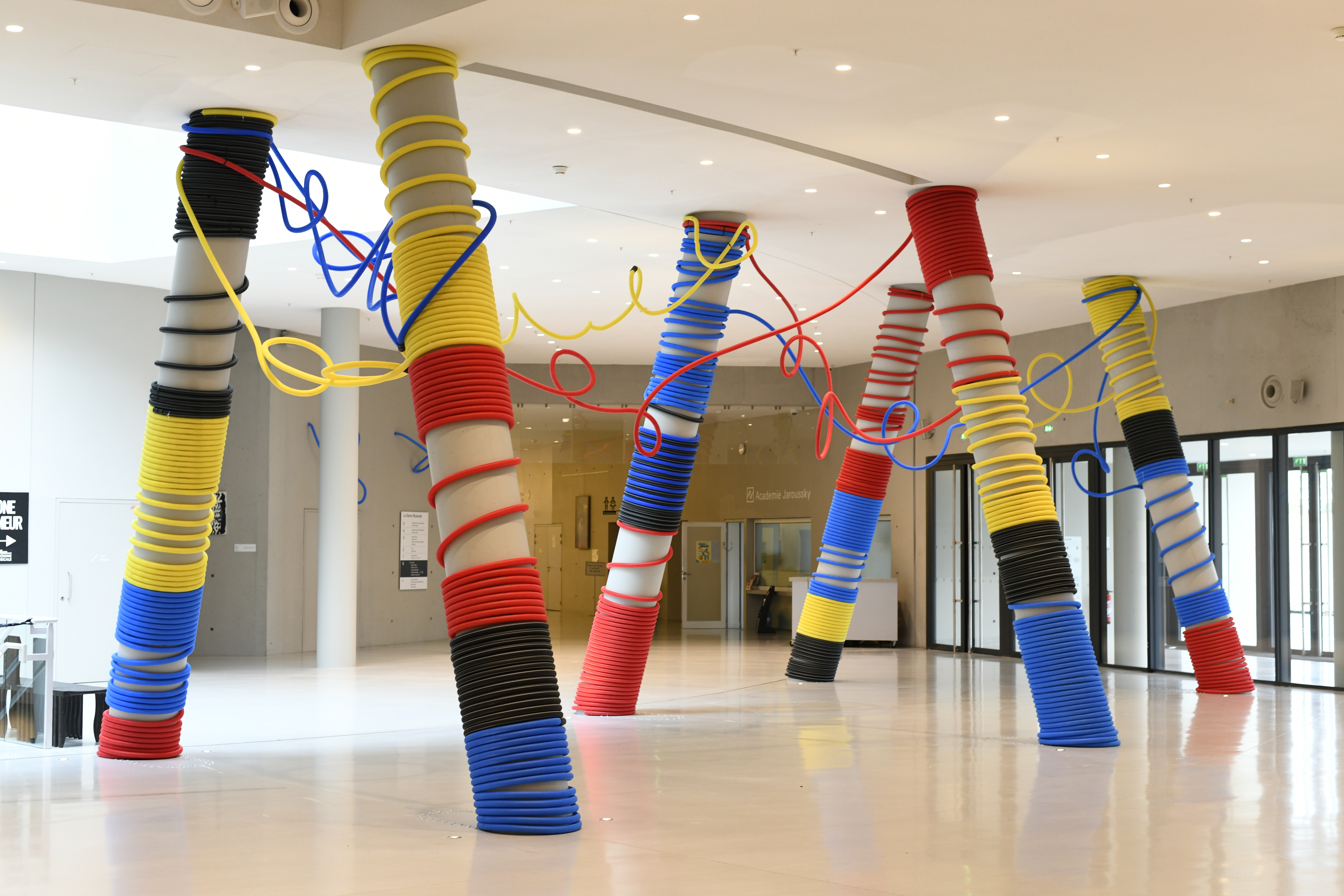 Alice Louradour fusionne dessin et sculpture pour créer des œuvres immersives à partir de matériaux récupérés sur des chantiers urbains. Fascinée par ces espaces en transformation, elle voit en eux des tableaux en mouvement, riches en potentiel graphique. Par ses multiples tuyaux de chantier aux couleurs primaires, Le Chantier Enchanté d’Alice Louradour transforme la Grande rue monochrome en un lieu coloré et ludique. Sa démarche se caractérise par une exploration de l'espace public et une volonté de réenchanter les lieux du quotidien.